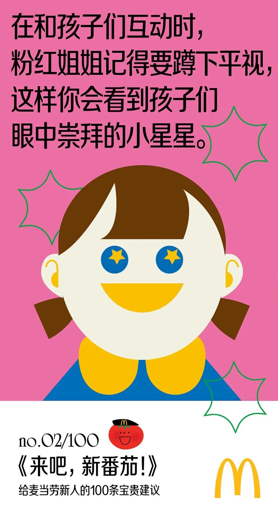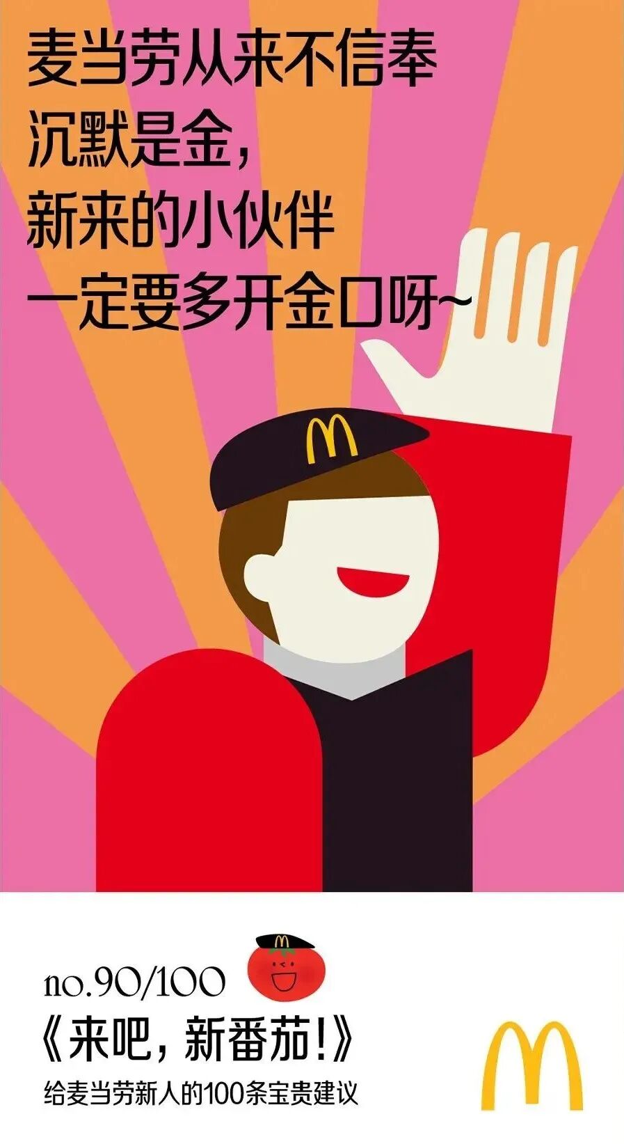 麦当劳在“520全国招聘周”发布的麦当劳新员工入职手册《来吧,新番茄!》,这份给麦当劳新人的100条宝贵建议,画风明亮可爱,建议有趣实用,充满麦当劳独有的温暖。