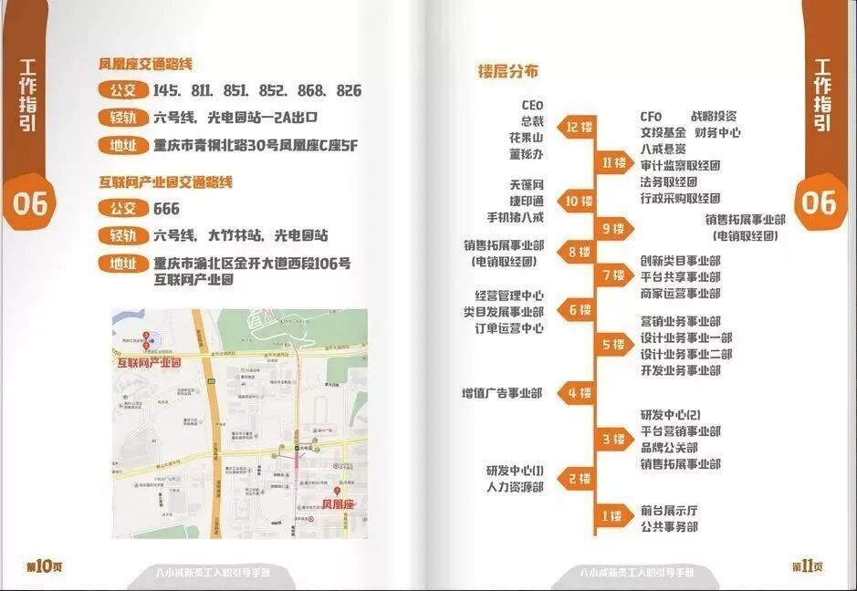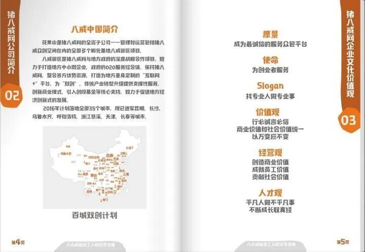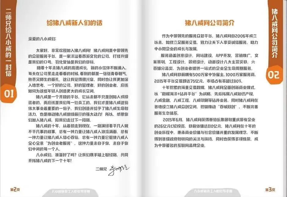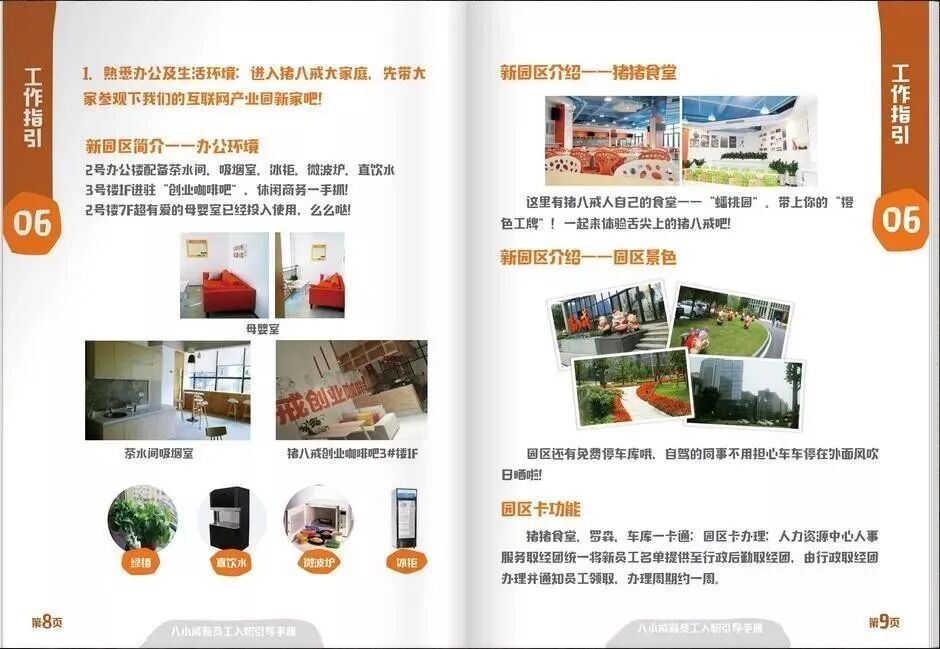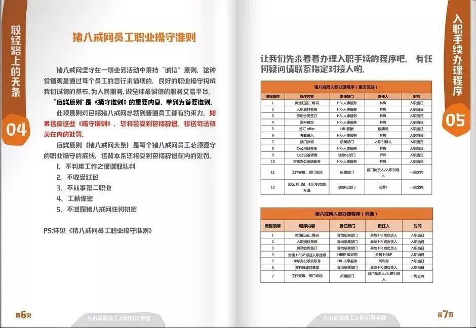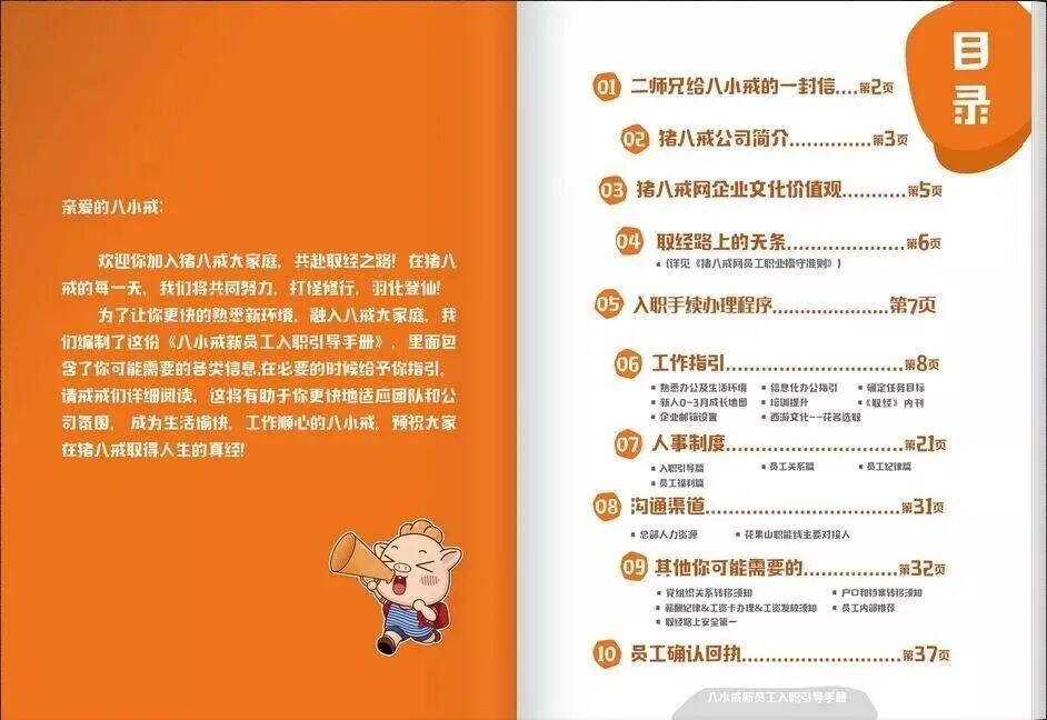 猪八戒为八小戒新员工做的入职手册里,包含了给八小戒的一封信、公司简介、企业文化价值观、入职手续办理程序、工作指引、人事制度、沟通渠道,以及其他杂事,将新人入职所需的内容整理的非常详尽。