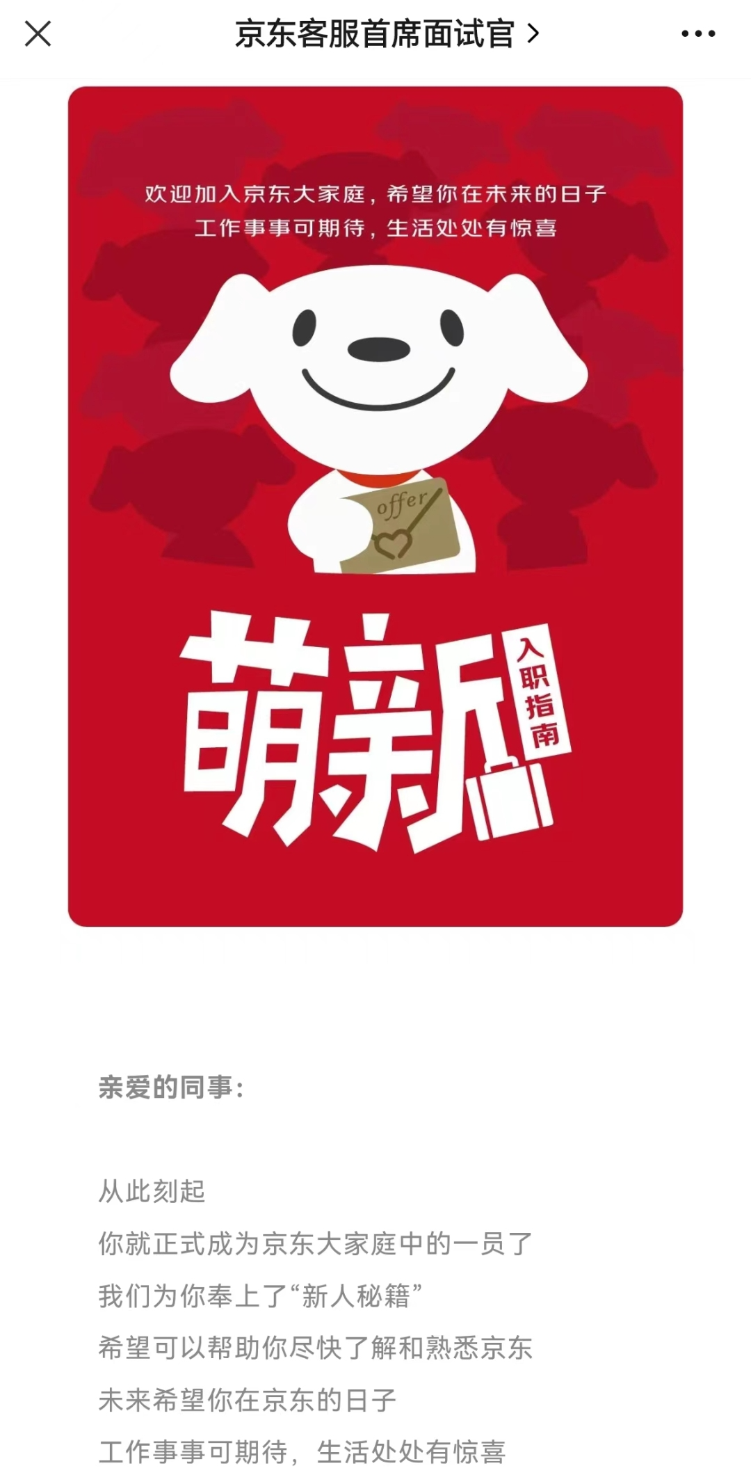 京东客服为新人设计入职指南,则是做成一张张卡片型,点击可跳转链接查看更详细的内容。