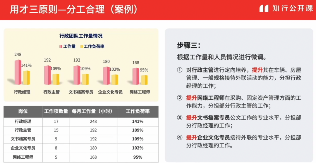 ①根据每个人职能权限和专业度进行初选,结合工作内容相关性初步分配。比如首先按照管理权限,划分只能由行政负责人负责的工作,如预算制定与审核、采购管理规范化等;然后按照专业性要求,确定只能由行政经理或专业人员完成的工作,如公文/督办、网络/系统管理等... 按照这个逻辑逐次分配完毕。