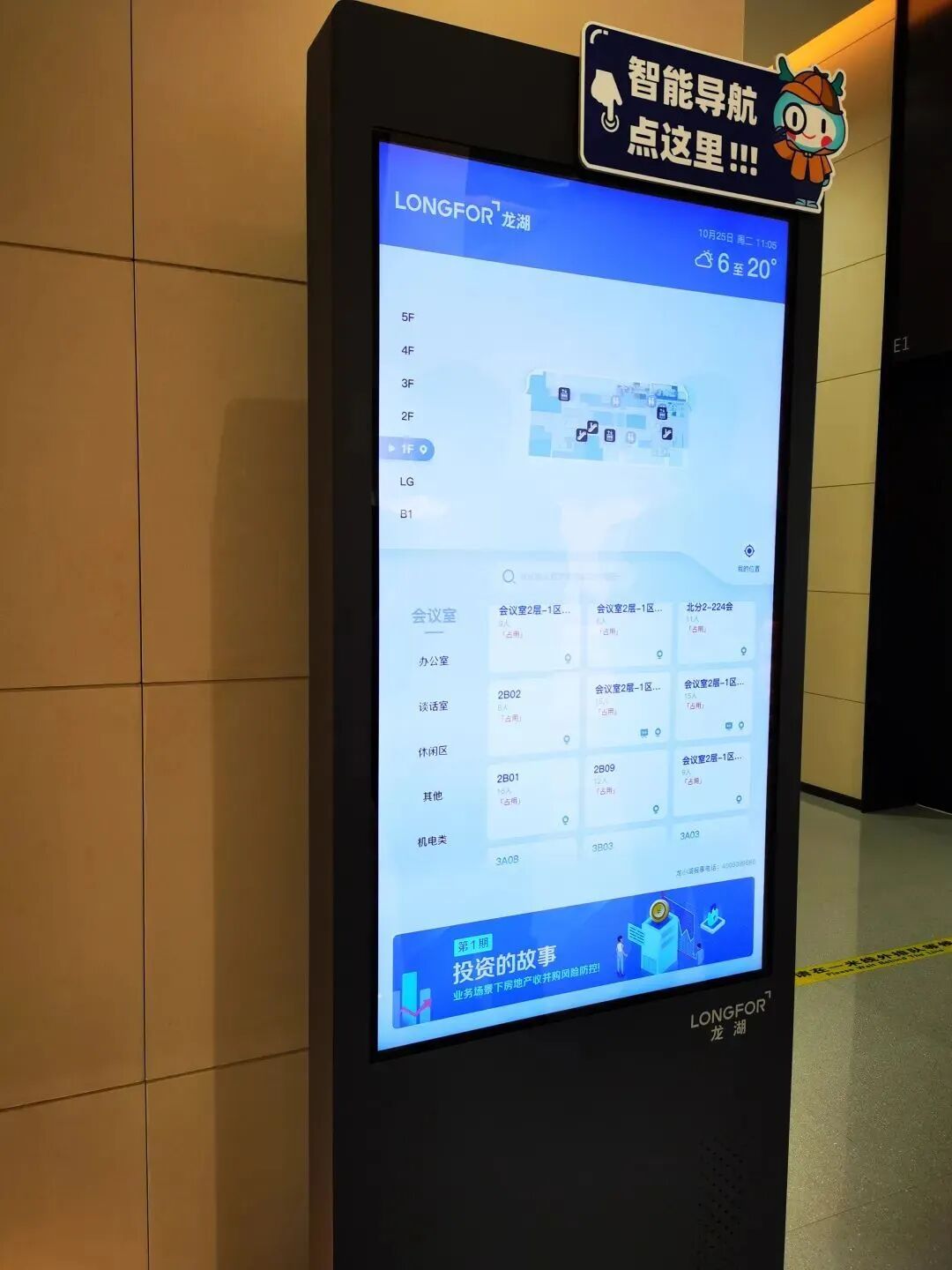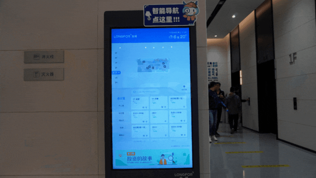 1.7万㎡层均面积,总有找不到的角落。为提高员工在大楼工作的便利性,全楼35台智能互动屏,配置在总部大楼每层关键位置。