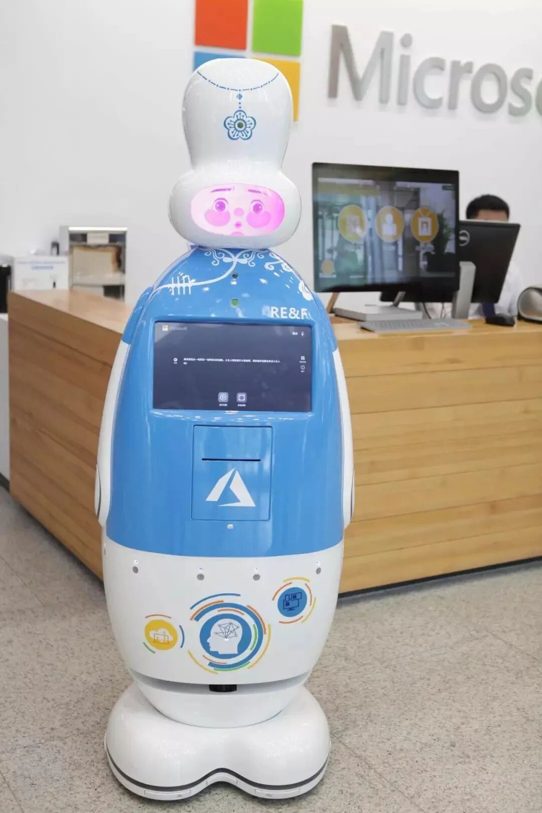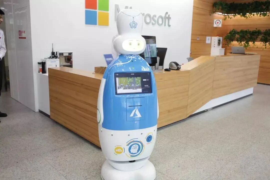 再比如微软的智能机器人小京。除了自由移动,带领参观和引路,还能与访客对话、唱歌!胸口的小屏幕里还有楼层地图指引。