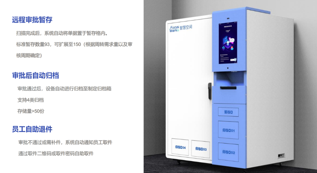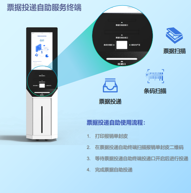Focuswork票据自助投递终端——即报销凭证投递机,可以解决报销凭证需专人收集整理,手写登记无法辨认统计等问题。