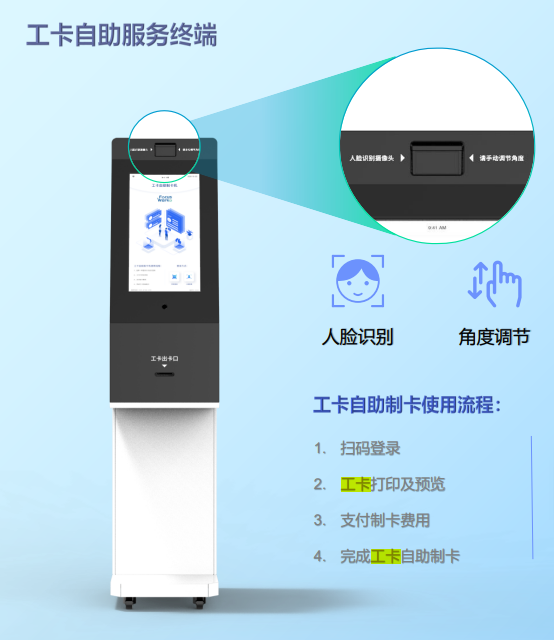 除了新员工入职工卡的办理外,如果员工不慎丢失了工卡,可仍然可通过自助工卡机来补卡。