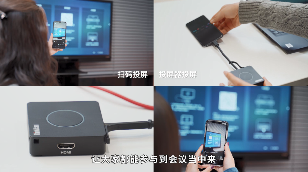 当然最便捷的还是联想大智慧屏支持多终端无线投屏功能,还支持四分投屏,可以同时展示四个屏幕内容,无论是电脑、手机还是Pad,都可以通过无线传输到大屏上进行展示,极大便利方案沟通讨论。
