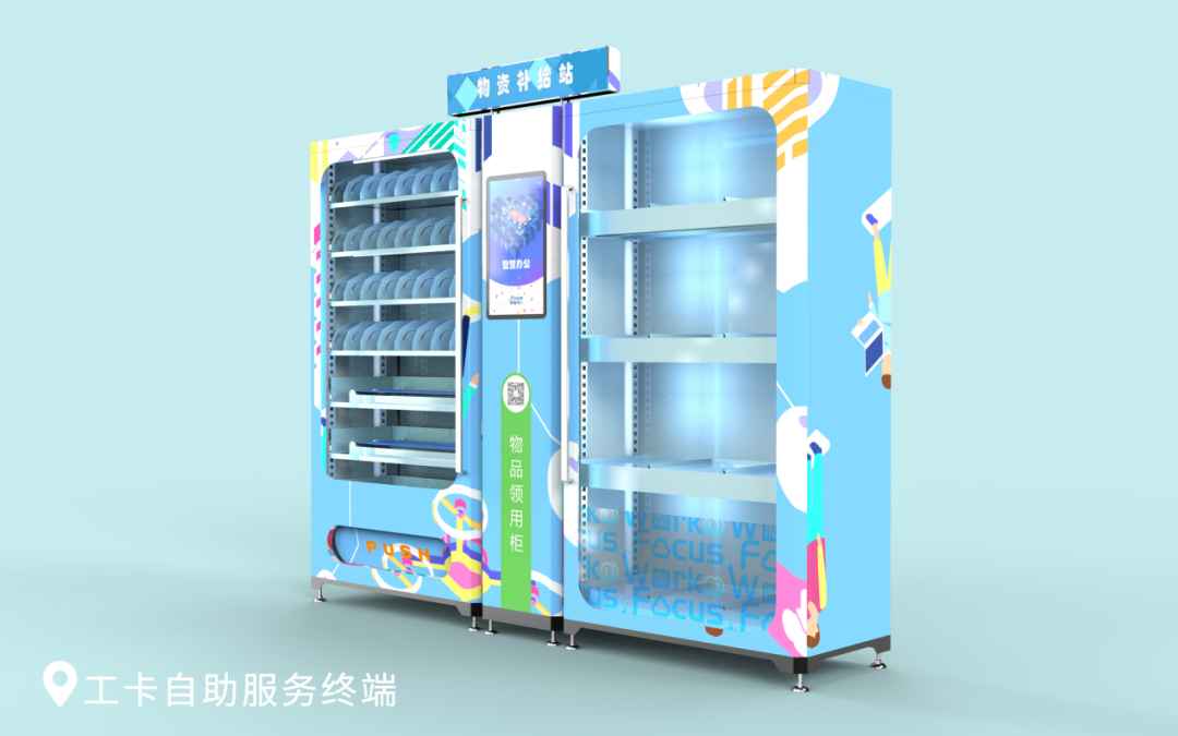 该终端可放置笔、本、订书器、剪刀等办公用品,也可放置生活物资,支持在线支付或企业内部结算系统。