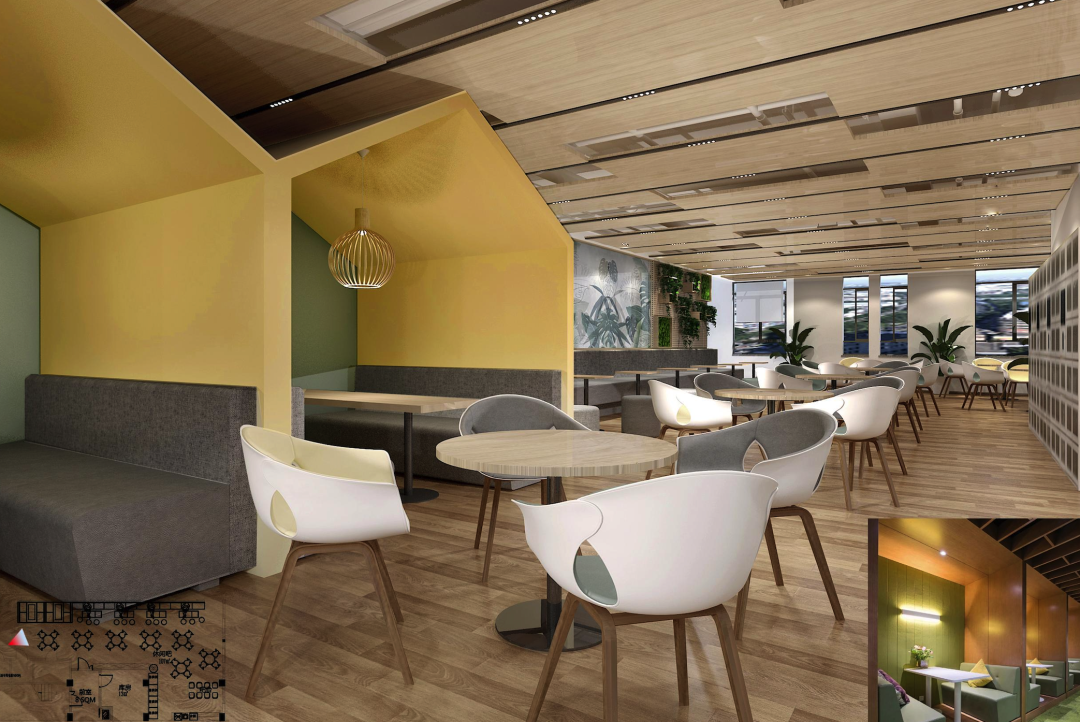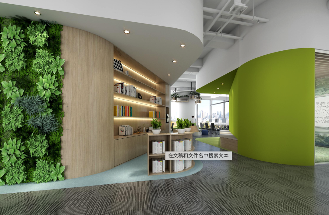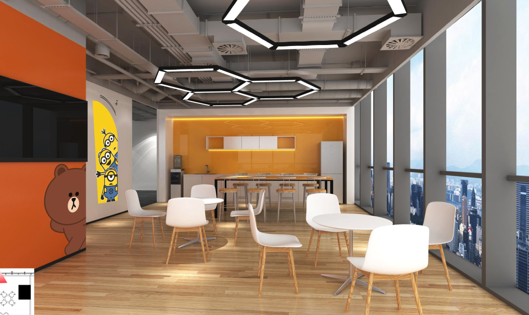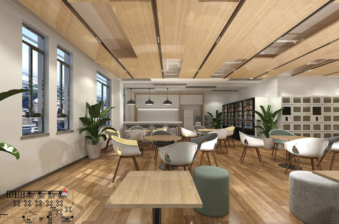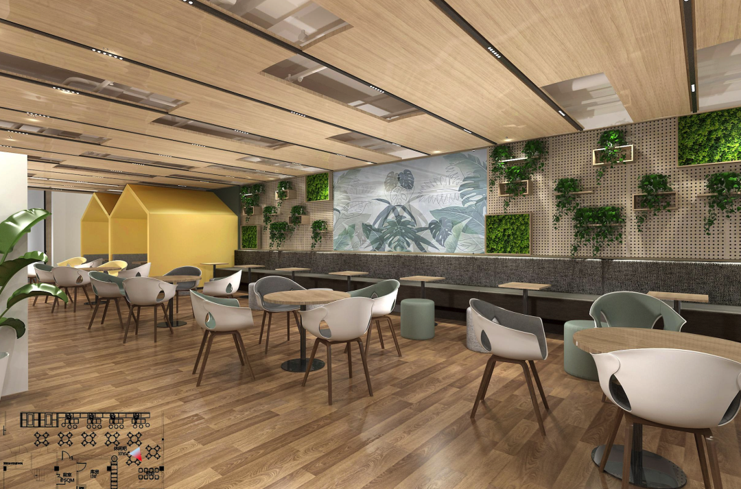 他们的多巴胺装修主要集中在休息区。整体使用了原木色材料装饰地板以及天花板,营造自然轻松的氛围,然后在和谐统一的空间中使用亮色绿植、家具以及线型灯光烘托空间氛围,带给员工好心情。