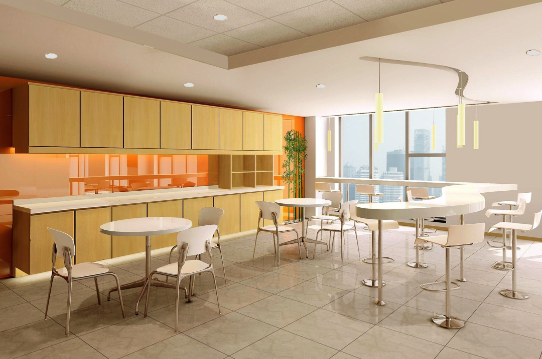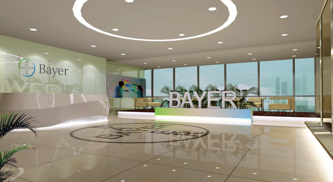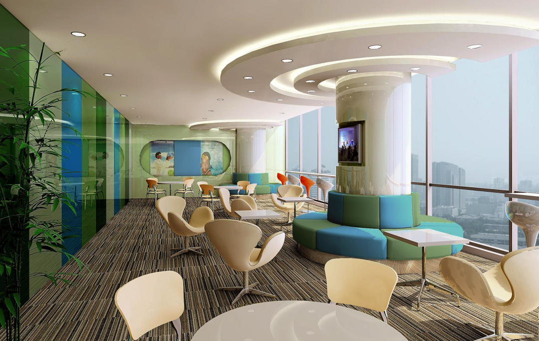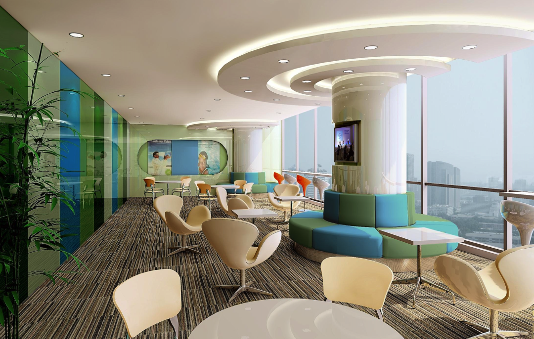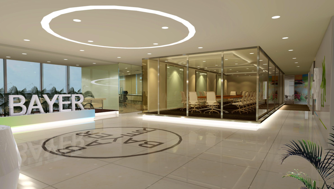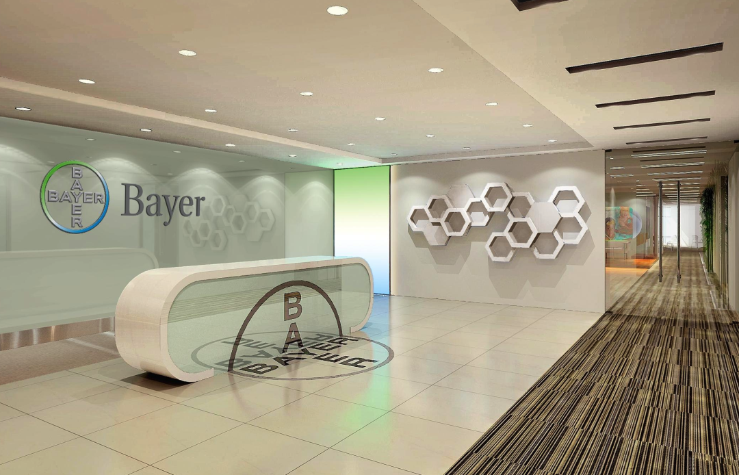 比如拜耳前台利用分子式的概念进行设计,体现企业性质。彩色沙发与亮色吧台椅增加了空间活力,让来访者心情放松。