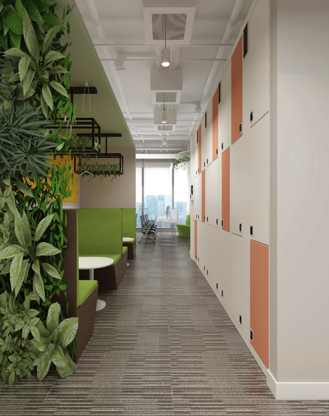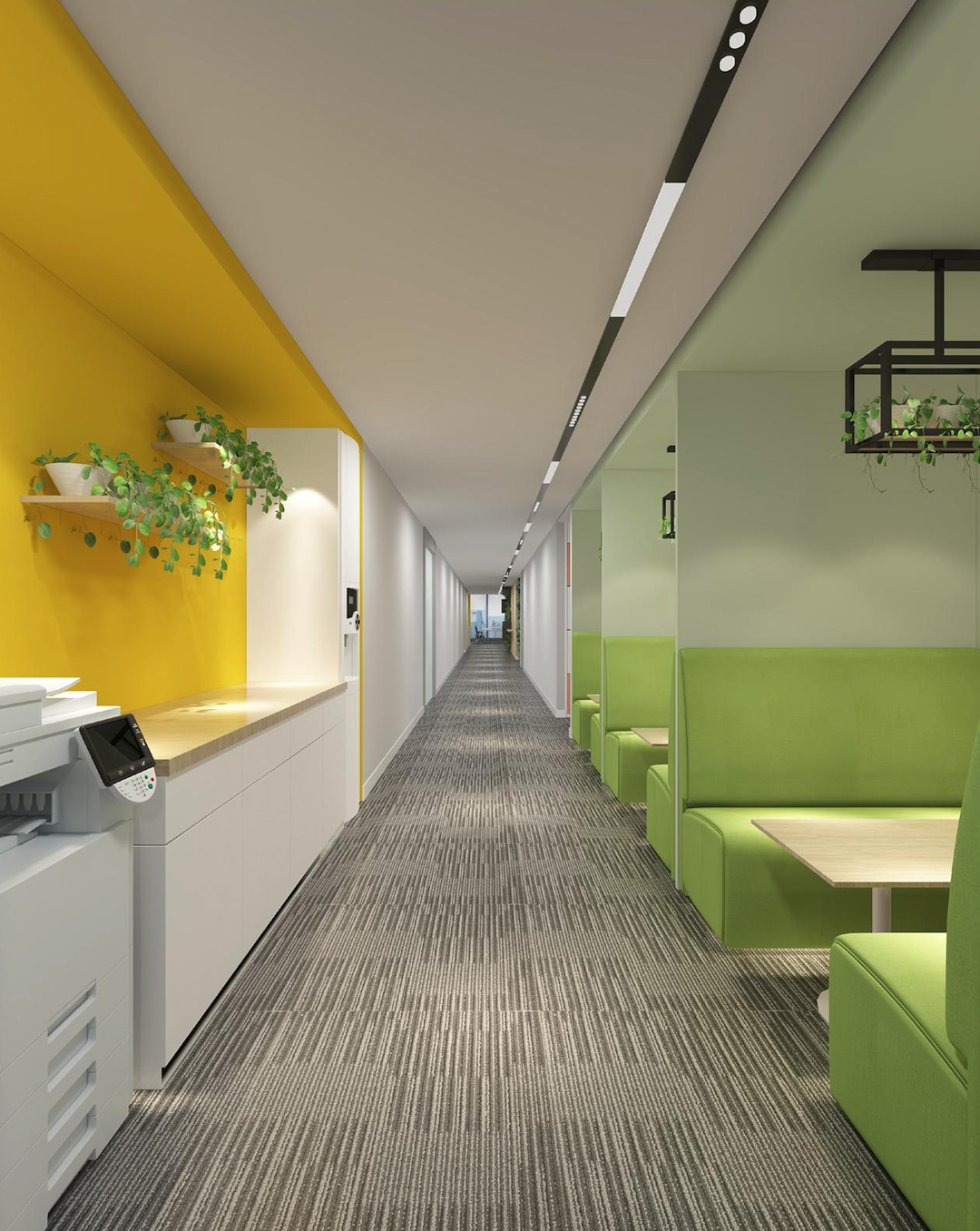 新东方的武汉办公室运用了绿植、彩色墙面与灯光的结合,在会议室、洽谈室、休息区以及公共空间打杂出富有生命力的多巴胺风格。