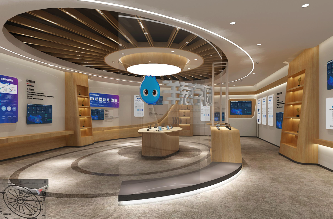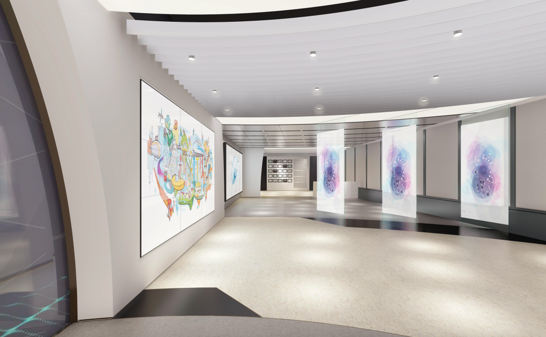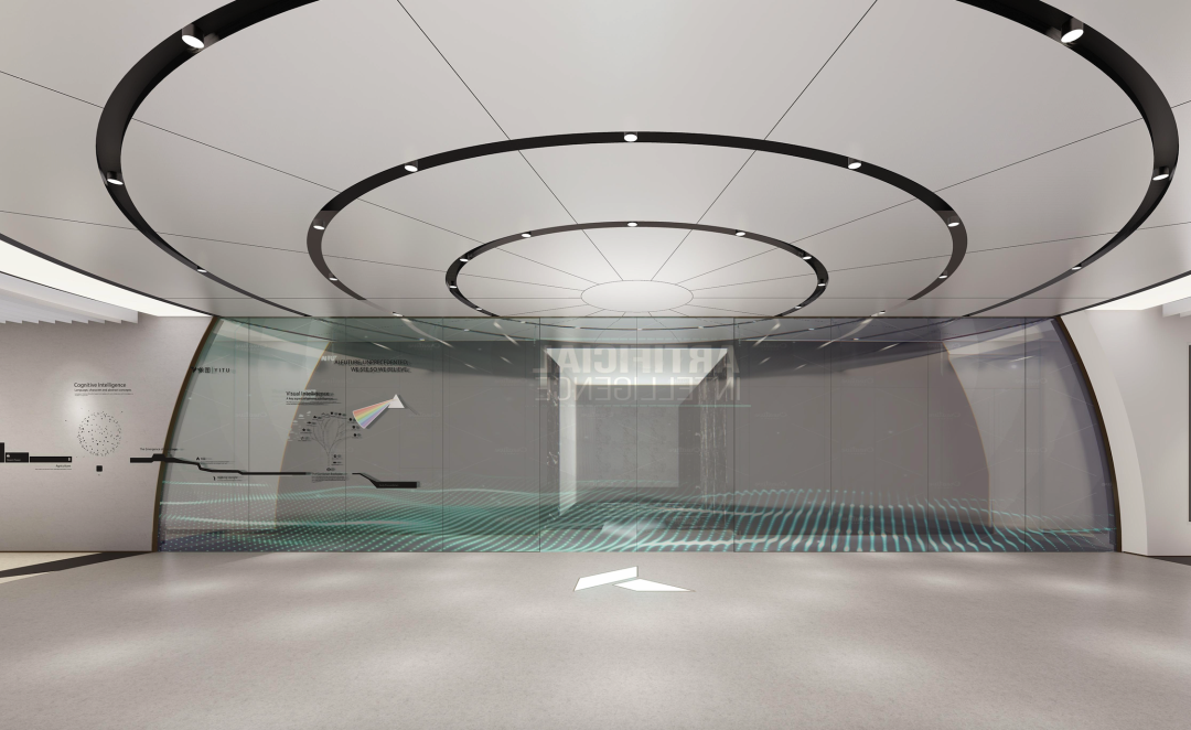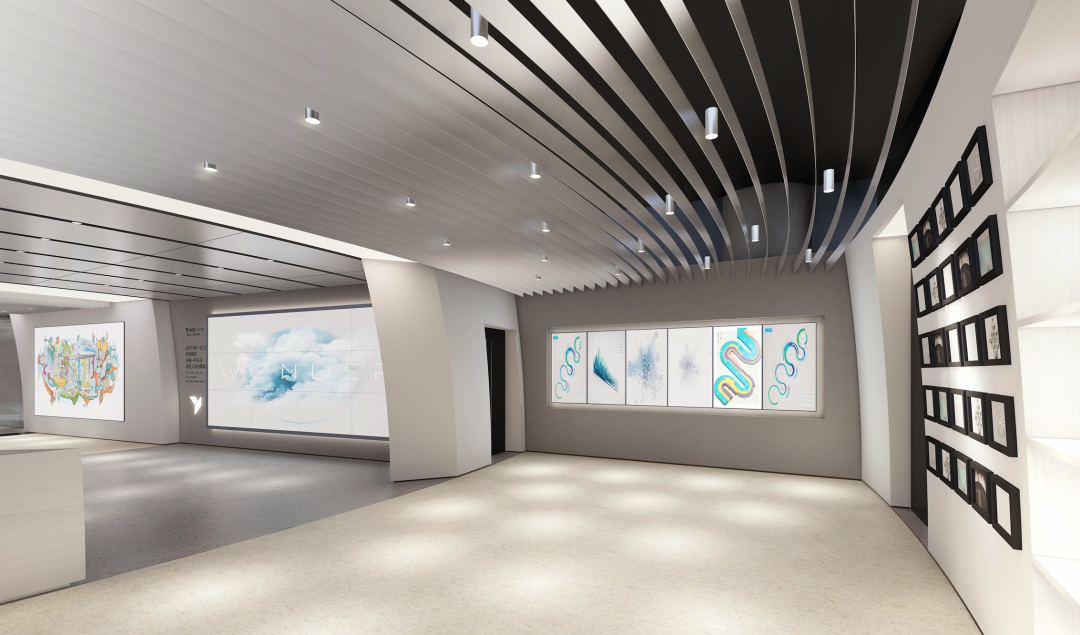 依图作为一家专注于人工智能、科技化的企业,整体环境呈极简风格,在保留空间功能的同时尽量简洁化。展厅的圆弧形空间让人在进入的第一秒就自然聚焦在地板上的企业logo。结合插画形式的图案作为背景、宇宙飞船、飞机等跃然其上,能让人沉浸在科技带来的畅享中,理解企业文化。