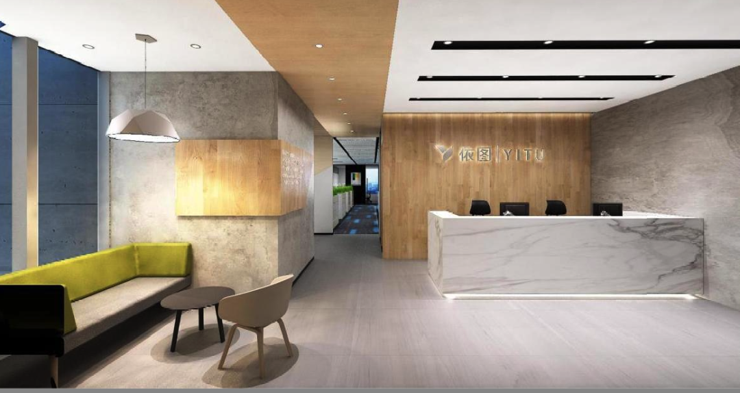 极简风科技公司,可以如何运用多巴胺元素?依图公司用前台空间的亮色沙发、纯白办公区的鲜亮绿植来打造!白色大理石前台凸显科技公司的气质,原木色背板起到中和作用,让整体空间融合了科技感与自然。