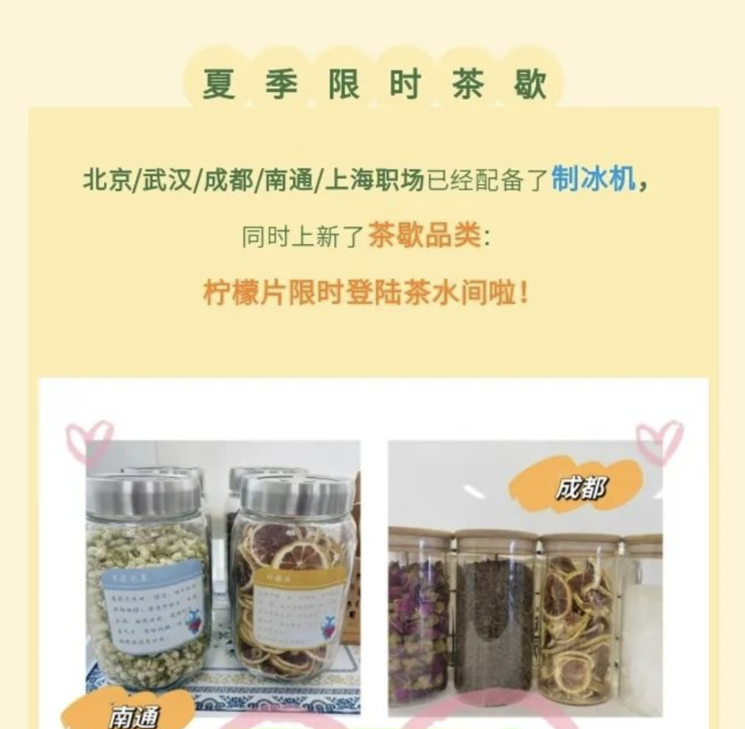 夏天的爽感之一当然少不了一杯冰饮畅快下肚,恒生电子为员工准备的冰镇柠檬红茶、冰镇酸梅汤、冰镇百香果茶轮番上阵。