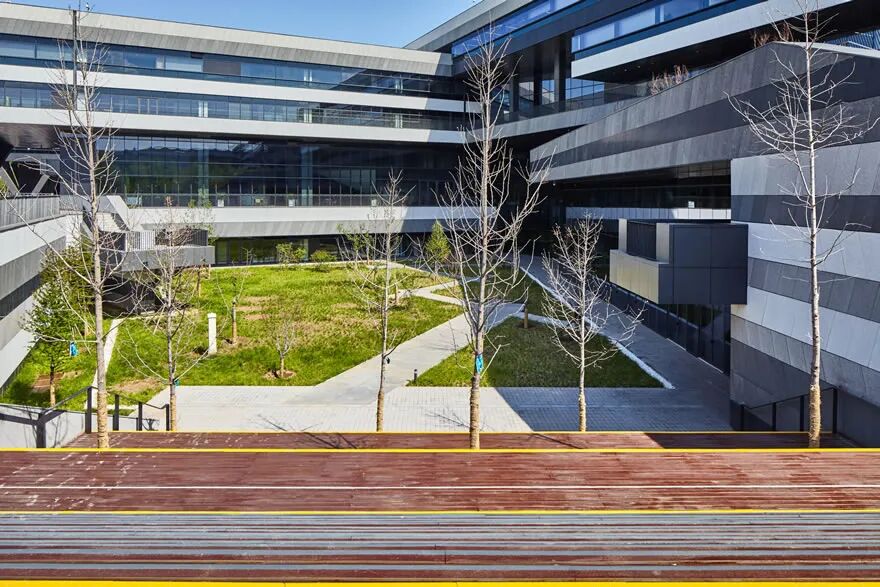 联想北京总部将绿色环保的可持续设计理念,全方位地融入了采光、通风、节能等可持续技术措施,在园区设计阶段就提前加入企业可持续发展理念。对于上班族来说,办公室室内健康不容忽视,联想北京整个园区通过提升等级的独立新风系统、PM2.5过滤系统、二氧化碳检测系统,大幅提高了办公环境的空气质量。屋面植被、园林景观的设计,也更有利于降低园区整体环境温度,减少热岛效应,带给员工最舒适健康的工作环境。