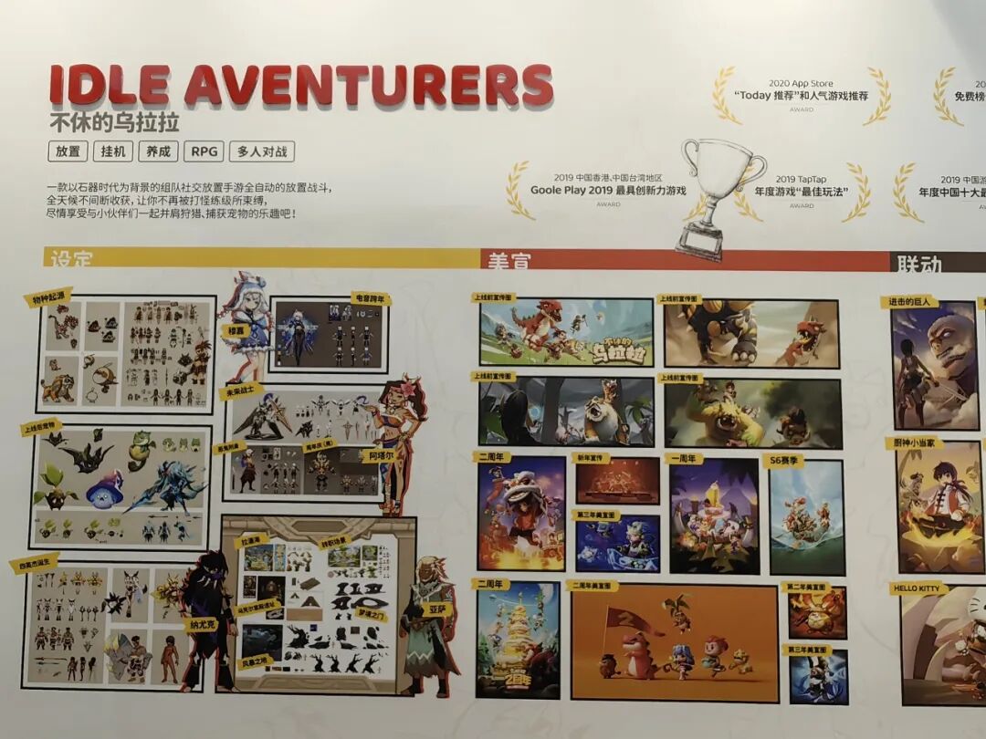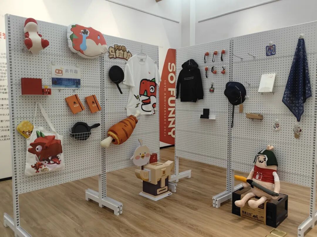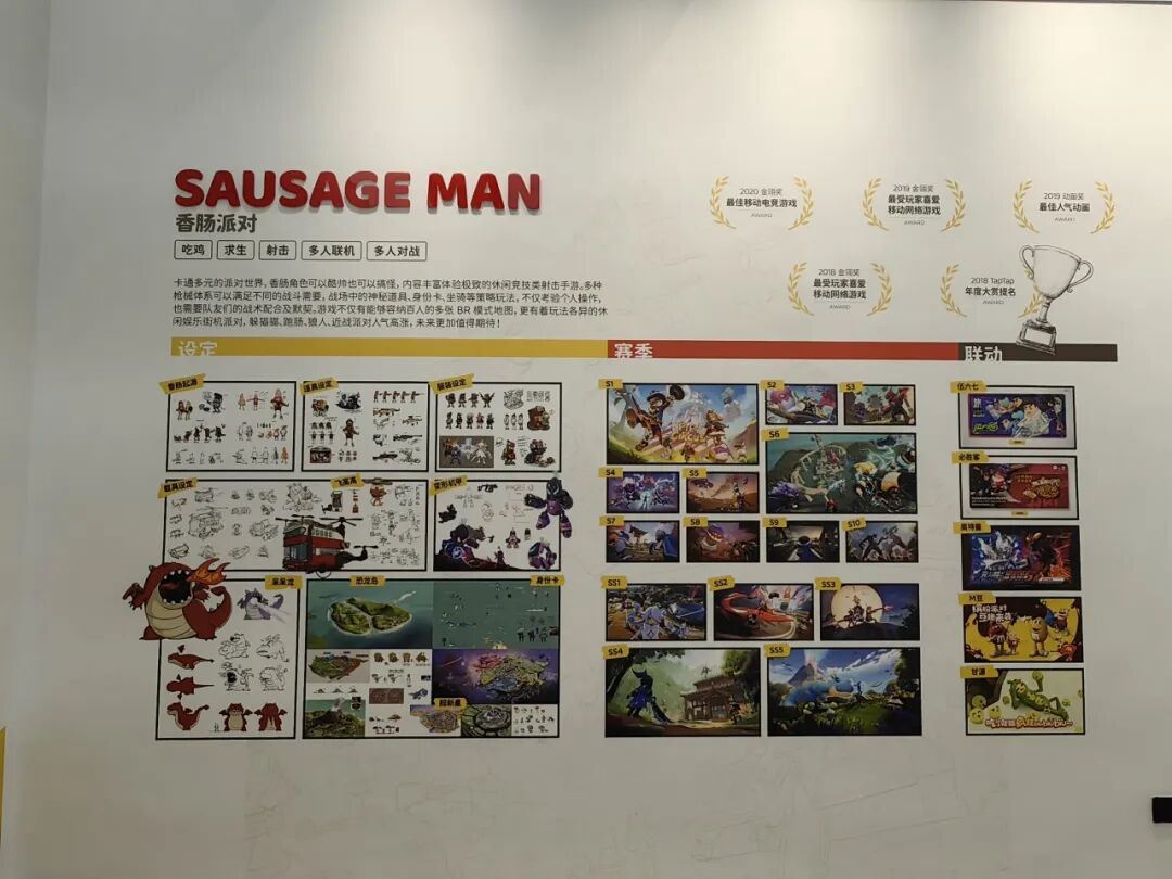 真有趣展览厅合理利用每一个墙面展现自家产品,并且巧妙地将产品元素立体化处理丰富展墙层次,增加展厅的观赏性。比如对经典游戏《不休的乌拉拉》、《香肠派对》的展现,从游戏设定到美宣再到联动都有详细的图文说明。