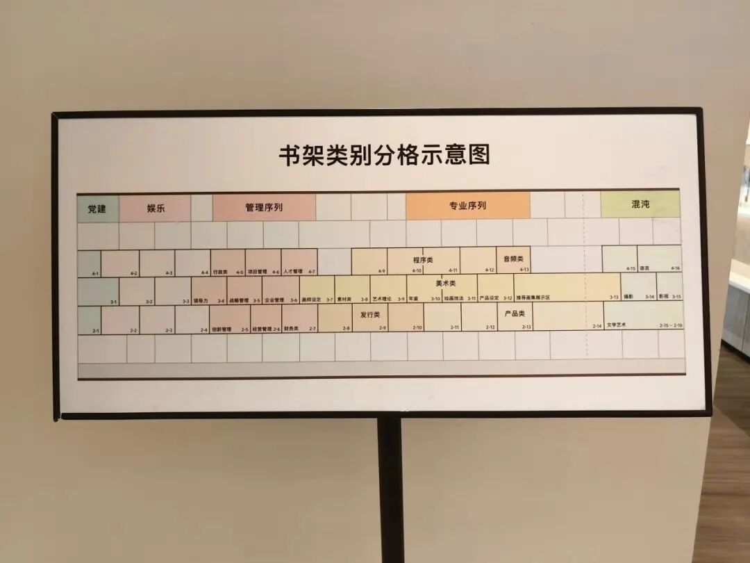 这里的木质书架、同色系木质纹地板、桌子搭配上柔光灯,让看书也成了一种享受。边上还立有书架类别分格示意图,想要找什么类型的图书清晰可见、方便快捷。
