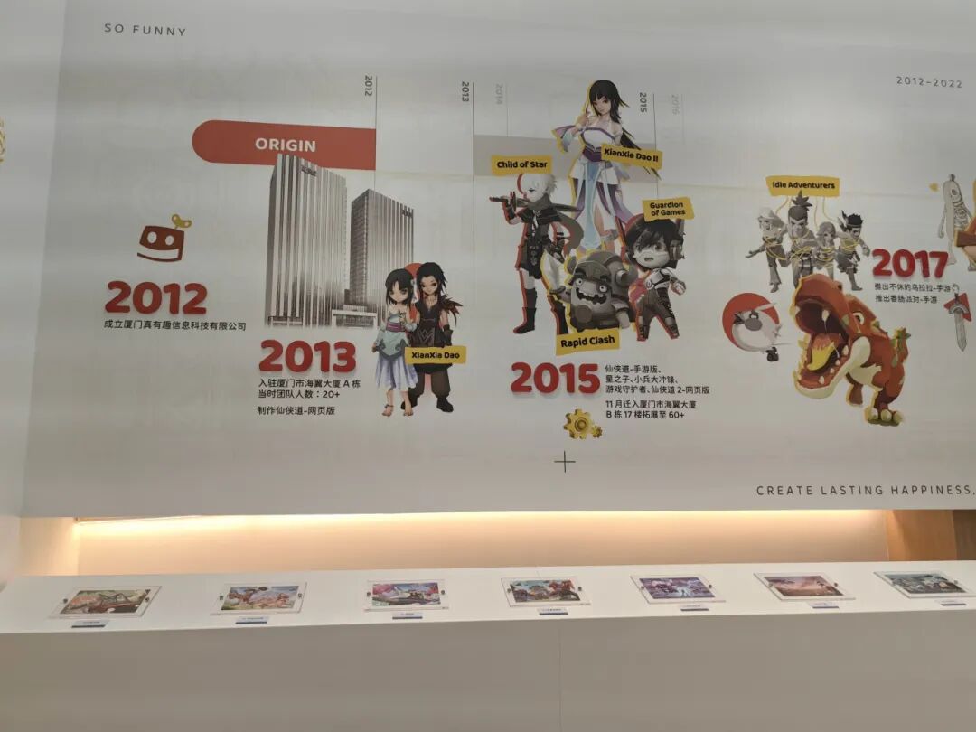 还有一面展示企业发展历程的文化墙,真有趣以游戏记录公司的成长,体现文化底蕴,比如2013年制作仙侠道-网页版、2017年推出不休的乌拉拉-手游等等,并在每个节点都配有游戏角色图,让文化墙更丰富。