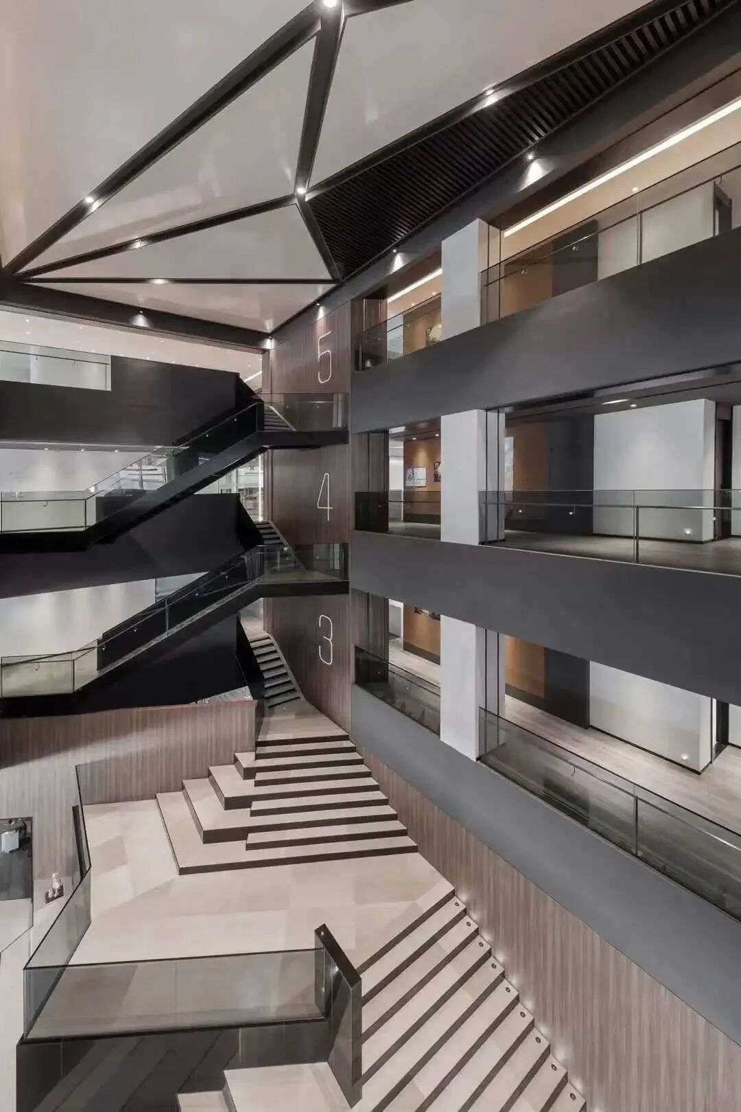 穿过二楼办公区就来到了充满气势、兼顾休闲与储物功能结合的中庭楼梯, 中庭的设计也让以黑灰为主色调的大楼显得格外通透。