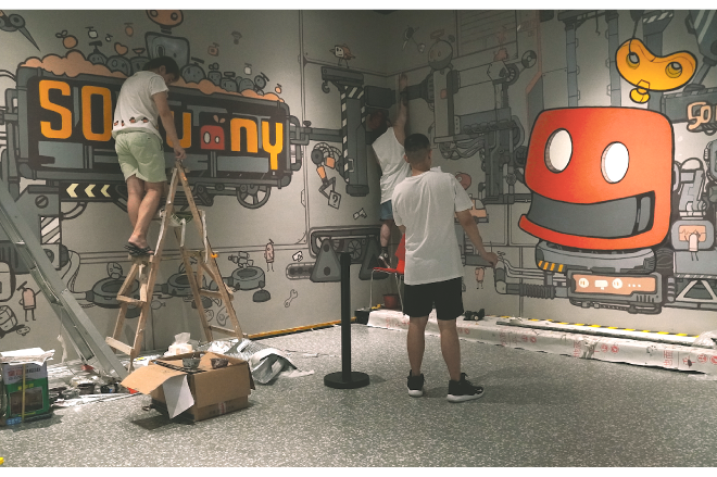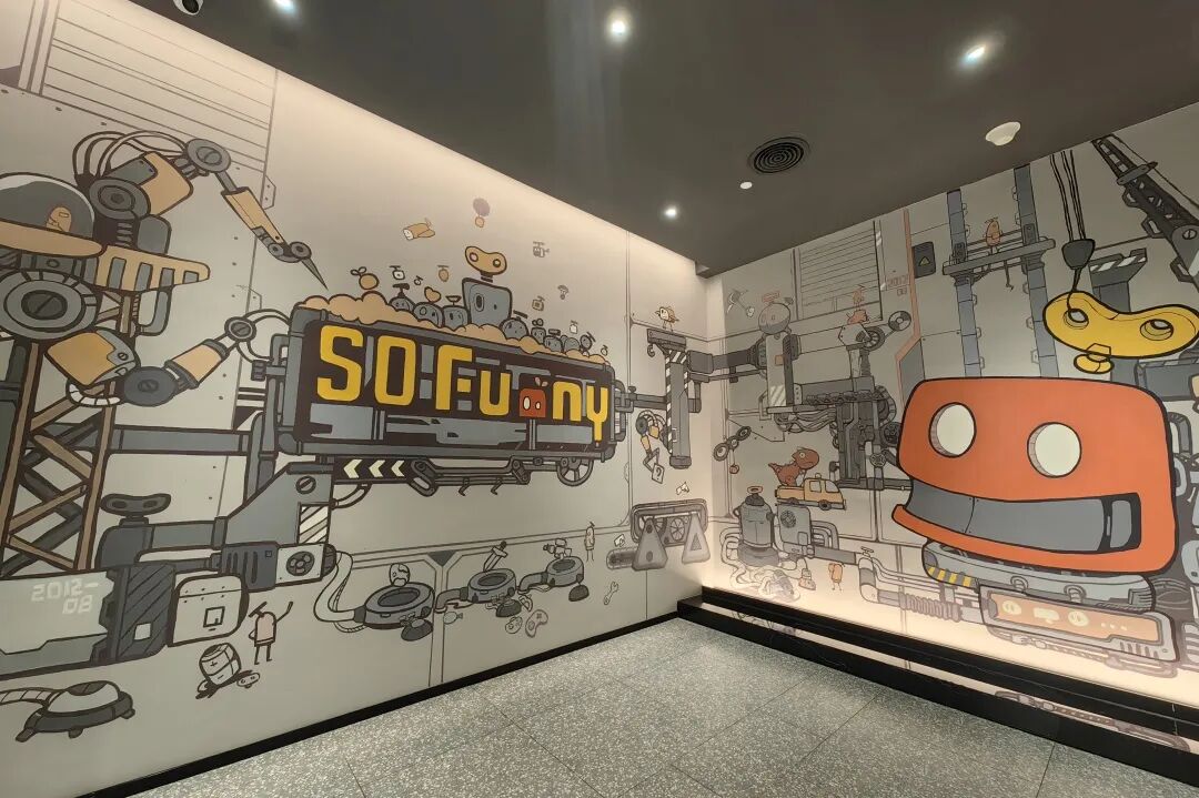 进入电梯等候区还可以看到真有趣小伙伴们亲自设计的墙绘。可以感受到真有趣是很认真的在尊重大家的创作,为员工们提供发挥创造力的空间。
