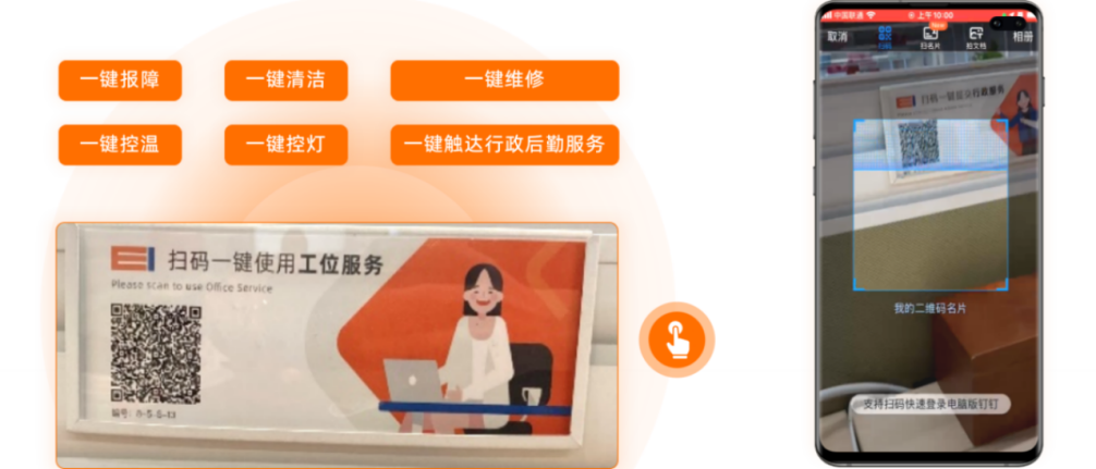 阿里的钉上服务,就能够帮助员工快速和精准地响应工位服务。每个工位配备一个二维码,扫码后会智能识别员工的具体位置,故障、清洁、维修、控灯、控温...统统都可以钉钉扫码,一键选择所需服务,立刻解决。