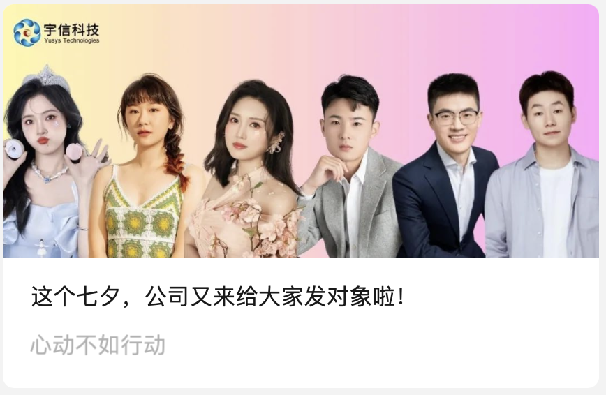 宇信将云相亲活动做成了七夕传统节目,这不,第四届宇信云相亲大会在众多宇信人的关注下拉开序幕,一大波相亲嘉宾登场,想要脱单,就行动起来吧。