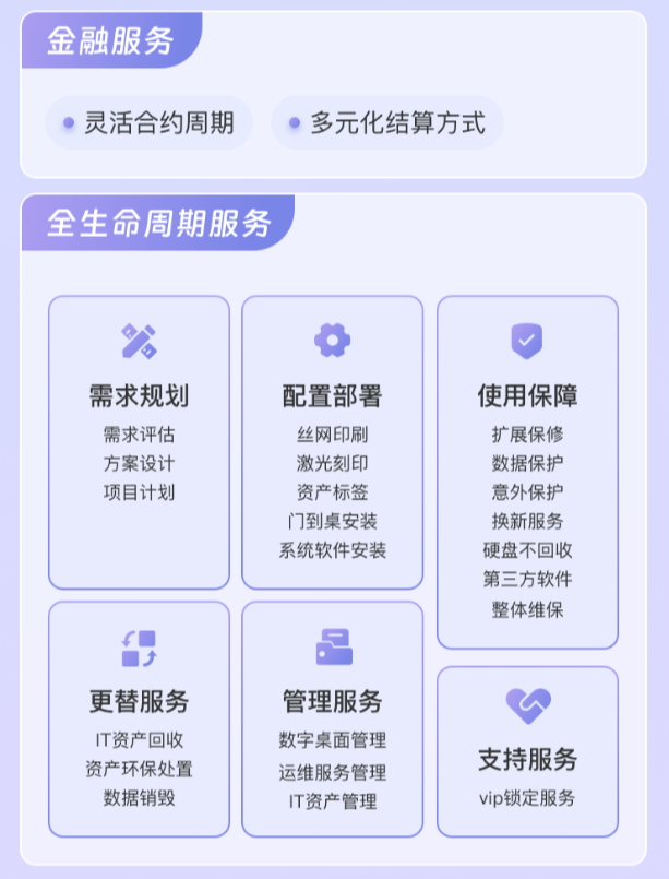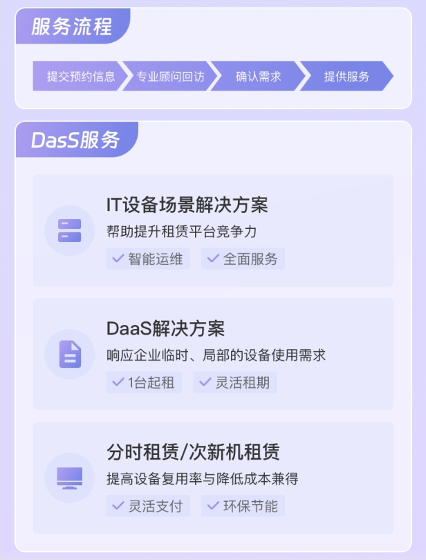 a.联想百应:联想百应的DaaS业务结合设备租赁、设备全生命周期的服务为中小企业客户提供生产和运营所需IT设备+服务+资金解决方案。方便企业在面对突发情况、展会时间等情况下合理获取设备支持。也减少了企业采购设备的成本,将资金运用在企业更需要的地方。