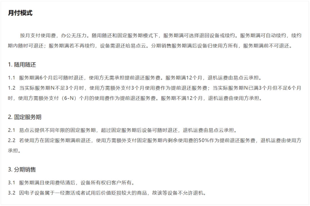 租赁方式根据服务方式的区分包括:租满即送、固定租期、随租随还、短期租赁等租赁方式。选择租赁方式时,企业需综合考虑以下几个因素: