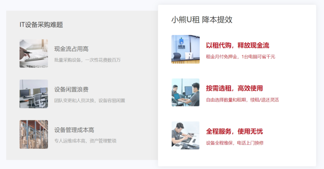 b.小熊U租:为企业提供包含IT设备租赁、IT技术支持、基于SaaS的设备管理服务和IT设备回收等在内的全栈式服务,为企业解决一次性购买IT设备的巨大资金压力、技术支持响应慢、IT设备管理灵活性不足及IT设备利用率低等痛点,全面解决中国企业面临的设备全生命周期管理问题,帮助企业实现降本增效和高质量发展。