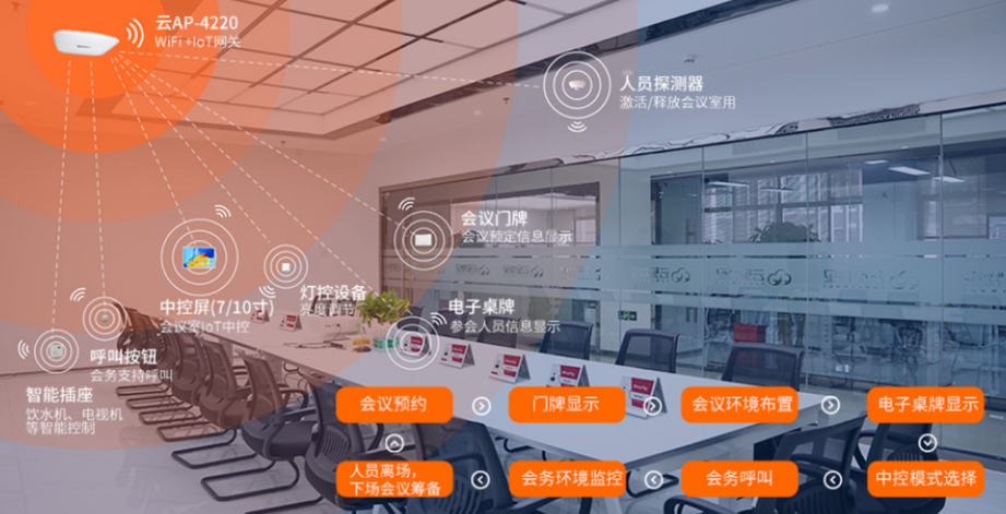还有阿里的会议室借助了云AP—WIFI+LOT网关,不仅配备人员探测器和红外传感器来感应空间中的员工,还联动了智能插座、呼叫按钮、中控屏、灯控设备、会议门牌和电子桌牌等等设备,真正地做到会议全程的智能化。