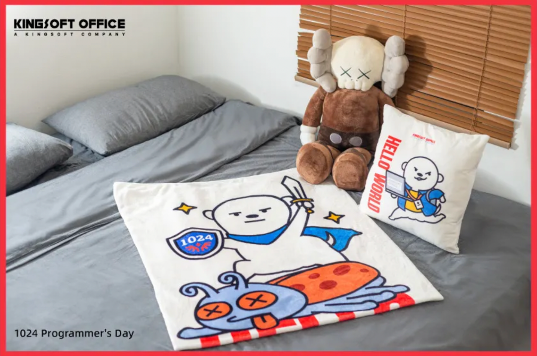 金山办公以「HELLO WORLD」为主题,准备了打工人福利套装:1024鼠标垫、抱枕午休毯套装、手机挂绳,程序猿金小獴亚克力摆件。