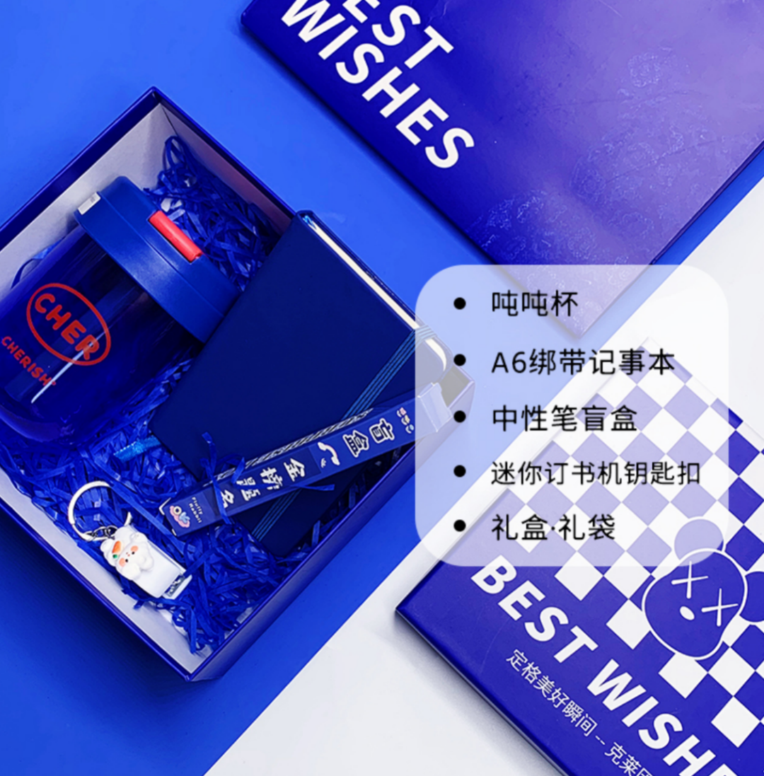 内容组成:水杯、A6记事本、迷你订书机钥匙扣、中性笔盲盒