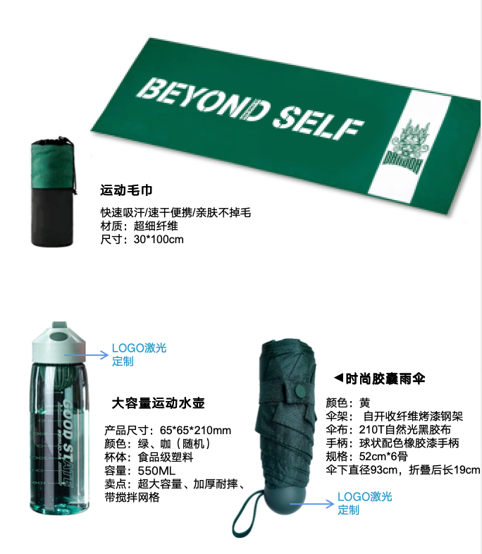 内容组成:斜跨包*1、大容量水壶*1、运动毛巾*1、晴雨伞*1