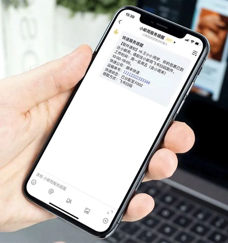 当员工的快递到达公司时,飞书的小邮局BOT就会发送一条取件通知到员工的飞书帐号;