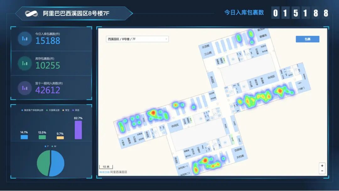 而包裹热力图则是为园区快递管理所研发的智能空间管理图示。页面会显示出园区每一层楼的包裹情况。管理人员还可以通过这张物流热力图实时了解整个园区入库包裹和库存包裹数量,方便他们快速科学地进行包裹管理和取件引导。