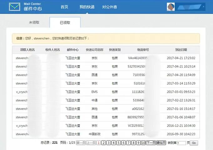 ↓每一位员工可在腾讯邮件中心后台查看未领取和已领取的邮件,每一条记录都包含了快递的领取人、收件人、邮件中心地址、快递公司名称、快递类别、物流单号和到达日期等信息。