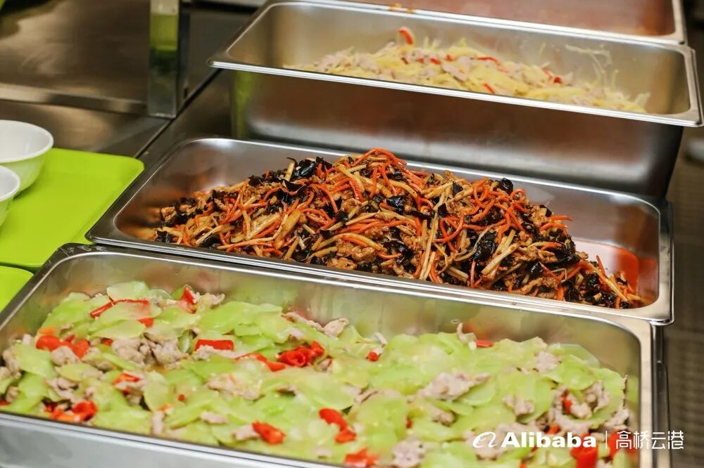 为提升用餐体验和菜品丰富性,阿里食堂还引入智能餐线,员工可根据口味和食量,任意选取菜品,吃多少拿多少,按克数计价,满足员工多样化就餐需求,还可助力食堂高效管理,减少食物浪费,打造绿色智慧食堂。