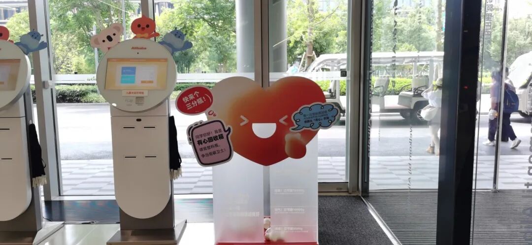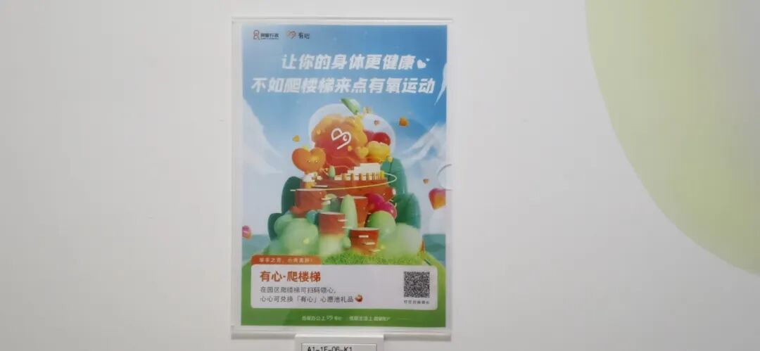 平日里,阿里也鼓励大家爬楼梯,在西溪园区的楼梯间可以见到各种标识,并且在园区爬楼梯还可以扫码领心,心心可以兑换「有心」心愿池礼品。