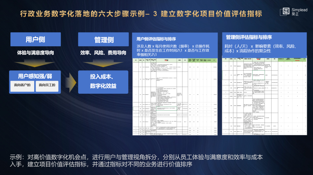 然后对高价值数字化机会点,进行用户与管理视角拆分,分别从员工体验与满意度和效率与成本入手,建立项目价值评估指标,并通过指标对不同的业务进行价值排序。