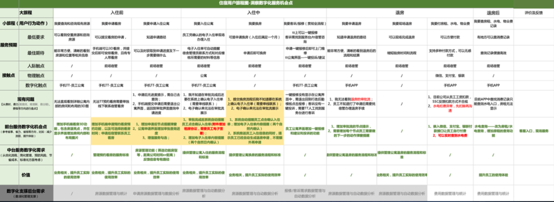 “以该公司的员工住宿为例,梳理后就能够发现这个中间能够被数字化提升的就是中间标黄块的这一点,其他的要么就是他们现在已经有了一个支撑,要不然就是觉得没有必要用数字化的投入来去实现。”