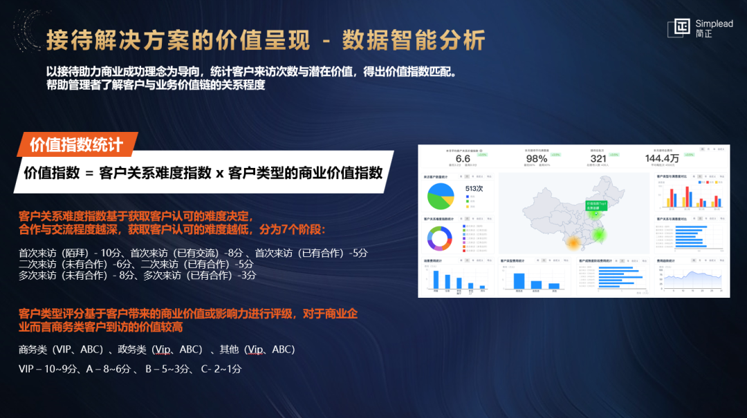 我们要先建立一个标准,把客户分层分类。每一批客户,如果是初次来访的,从客户关系的难度系数来说,他的关系难度是10分,多次来访的,他的关系难度系数可能是3分。然后是他的类别,比如说商务类的,是来促进签单的,还是政府类的观看,我们都要给它乘以价值指数。这样营销部门和相关的业务部门看到这个价值指数特别高的,他就会关注他的这些客户什么类别,价值主诉特别高的,他再去跟进这个客户,一定能达成。”