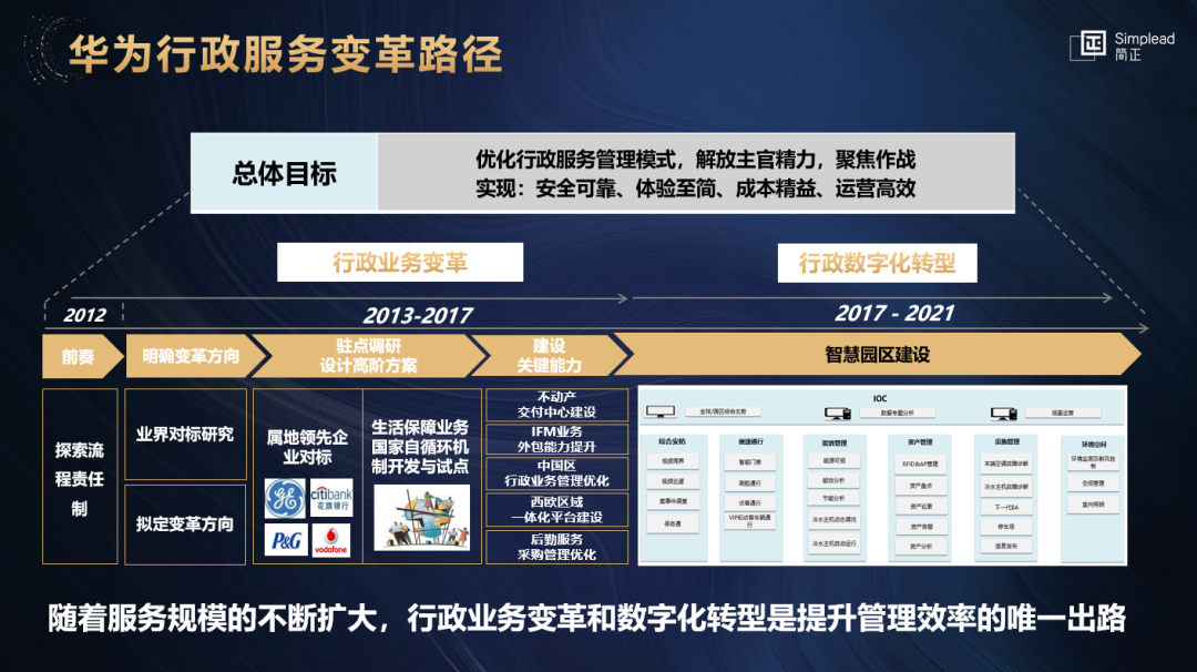 在现场精彩的演讲中,姜晓梅还向大家分享了前司行政服务的变革路径,从2012年探索流程责任制开始的行政业务变革,到2017-2021年智慧园区建设完成行政数字化转型,也正是一个随着服务规模的不断扩大,通过行政业务变革和数字化转型来提升管理效率的路径。