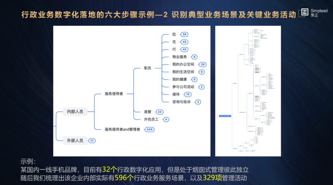 首先了解到该公司目前有32个行政数字化应用,但是处于烟囱式管理彼此独立,通过一层一层的梳理又发现该企业内部实际有596个行政业务服务场景,以及329项管理活动。