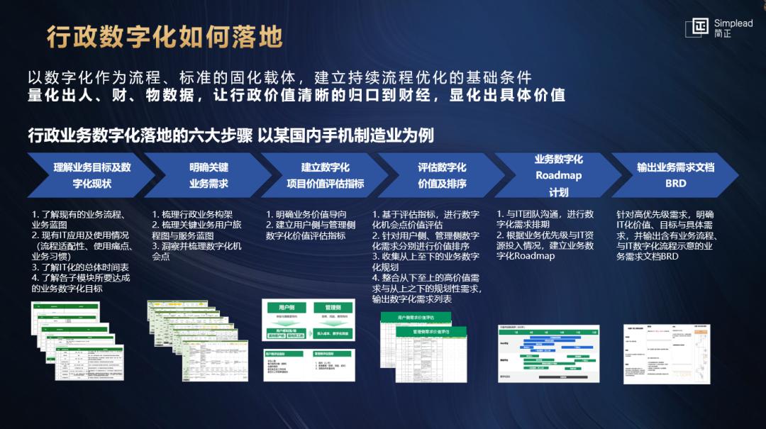 演讲中,姜晓梅更是以某国内一线手机品牌为例,向大家讲述了行政数字化落地的六大步骤具体应该如何做。