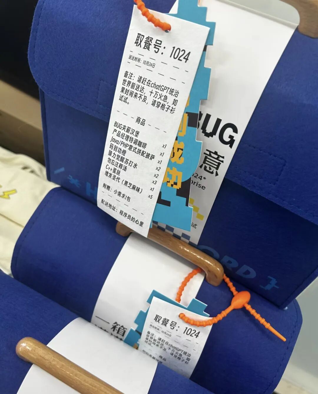 另外还有一份“橙”意满满的餐包,不仅食物的名字很深得程序员的心——BUG夹薪汉堡、产品经理特调咖啡、勿忘注释汤.....,连配送地址都是——送到程序员心里,不得不说,浪潮可太用心了!