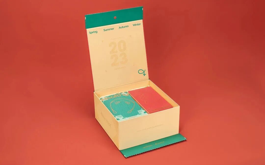 可以将包装外壳设计为挂历,开启一波复古风潮。比如去年字节跳动将礼盒包装设计为挂历+写字板,揭开礼盒后可循环利用。内层覆盖了循环可擦膜,使用马克笔即可随性创造记录灵感,还搭配了12张五彩缤纷的月历卡片,方便进行依次粘贴使用。