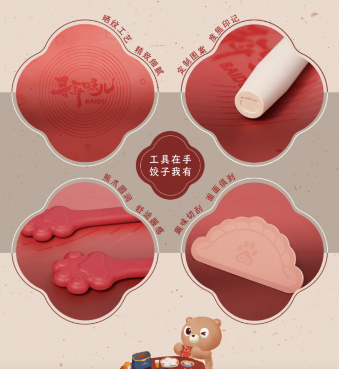 比如百度去年的包饺子工具内含擀面垫+擀面杖+挑馅勺+切面刀,还有吉语祝福筷子6双、定制蘸料碟6个,非常丰富。