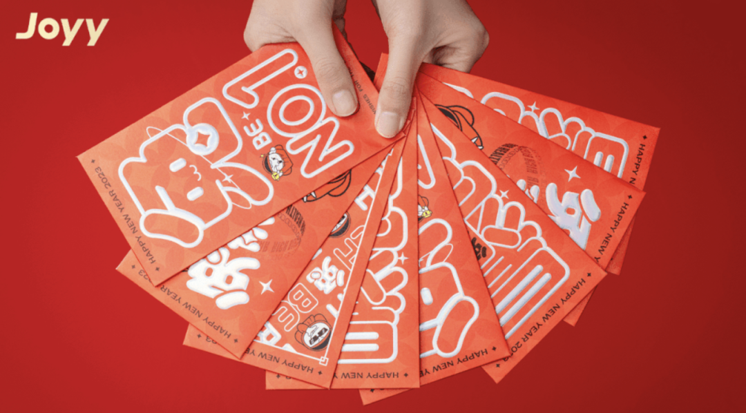 红包风格也可以设计得活泼轻松,上面的祝福语也可以是流行的、俏皮的。欢聚集团去年使用了“兔来运转”“兔然暴富”的谐音梗系列。