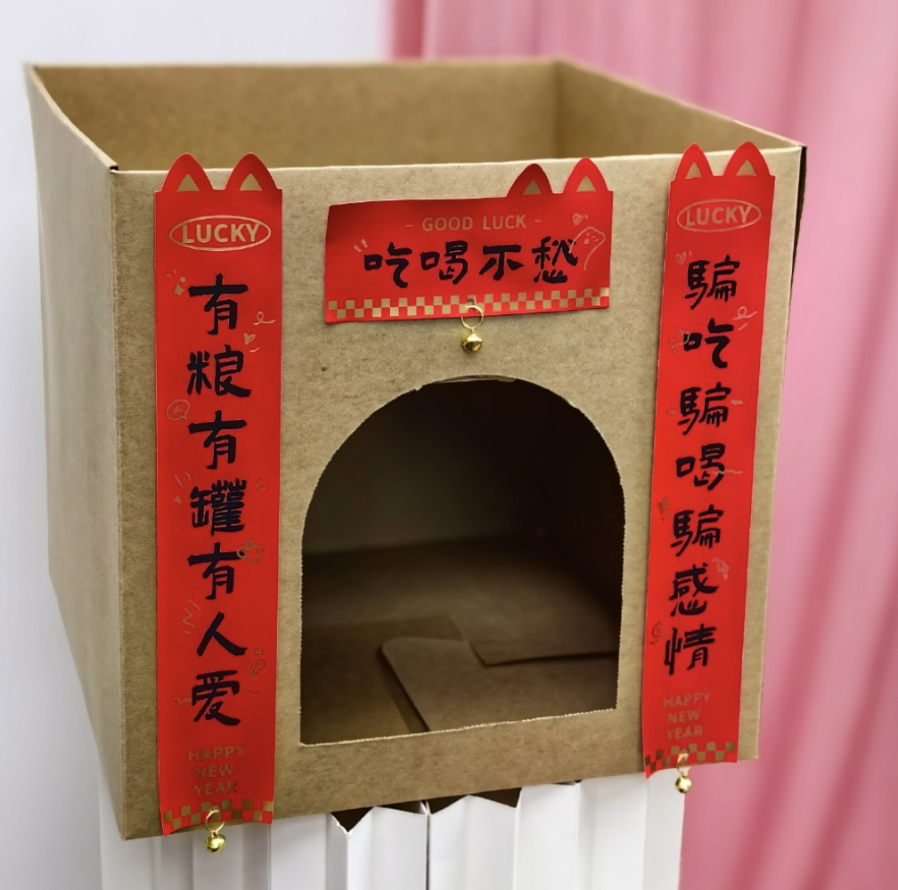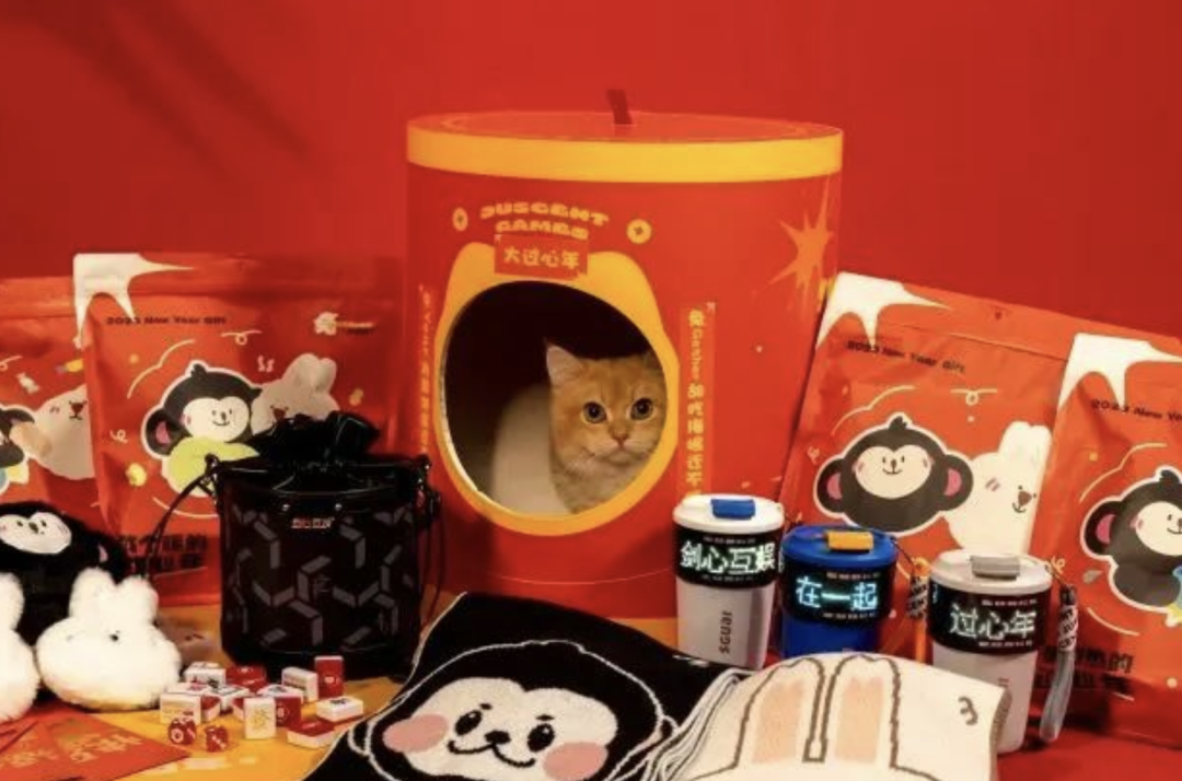 纸壳还是猫猫最爱,你可以将外包装设计成宠物窝,给员工们的毛孩子送一份心意。譬如去年剑心互娱礼盒两用式设计,爆竹炸开后变身猫窝,灵犀互娱也用了这样的思路。
