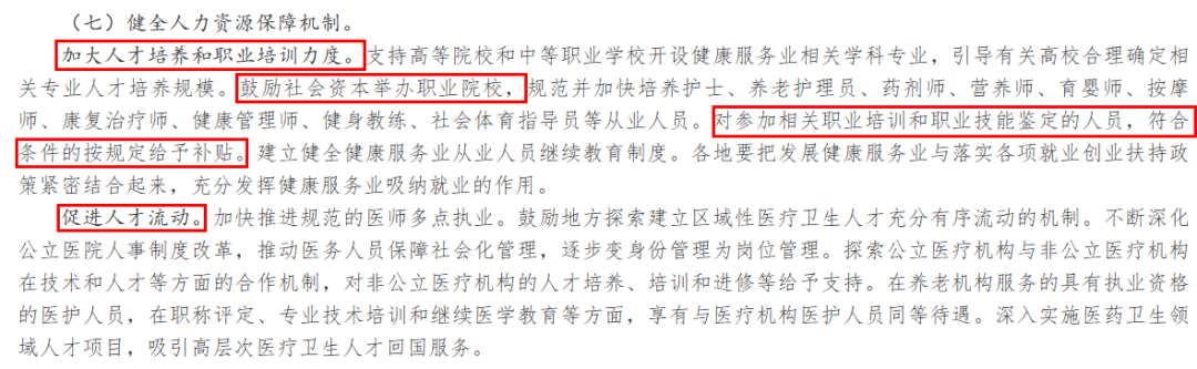 在此前《国务院关于促进健康服务业发展的若干通知》中也提到了:将会加大人才培养和职业培训的力度,对于参加相关职业培训和职业技能鉴定的人员,符合条件的将按规定给予补贴。也在一定程度上体现了国家对此的重视程度。