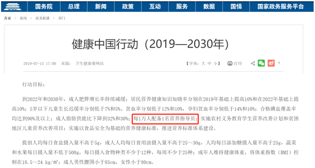 目前我国的专业营养师人才不足。国务院发布的《健康中国行动(2019-2030年)》指出,到2030年,要实现每1万人就配备一名营养指导员,但目前我国每40万人才有一名公共营养师。