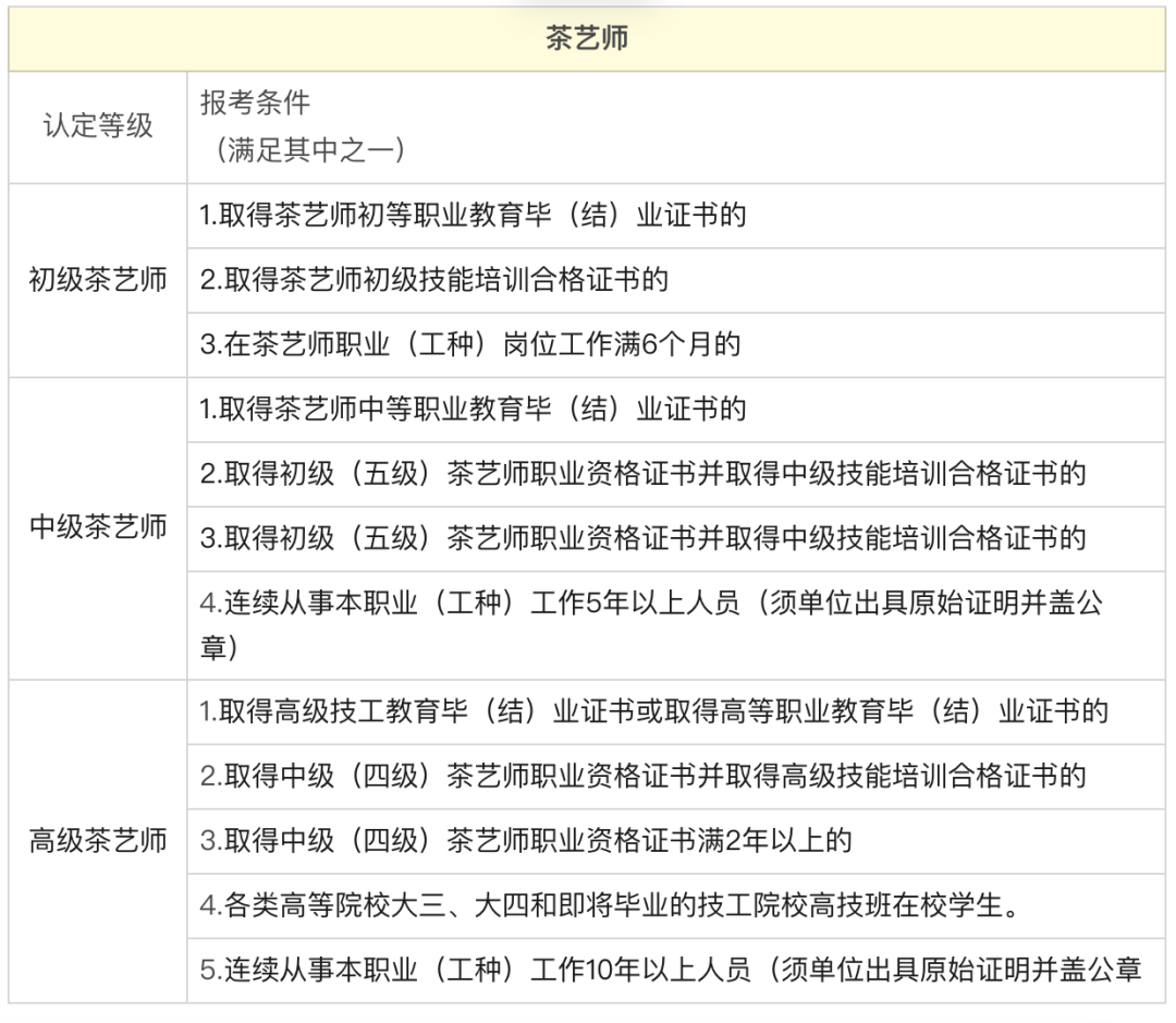 茶艺师资格证分初级、中级和高级,各自报考条件如下⬇️